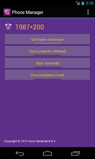 Met de Voizz Phone Manager kan je een of meerdere extensies van de Hosted PBX van Voizz Nederland beheren. Met de app kan je verschillende doorschakelingen instellen. Bijvoorbeeld naar een mobielnummer of een vaste aansluiting. Of een doorschakeling naar de voicemail. De app overschrijft de incoming call rules.