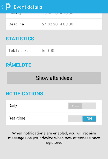 •View live statistics including number of registered attendees and total sales.