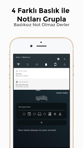 مع Notiq، يمكنك إجراء الوظائف في حياتك اليومية أمام عينيك عن طريق إضافة ملاحظاتك القصيرة إلى شريط الإعلام.(حتى على شاشة القفل! ..)