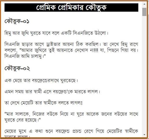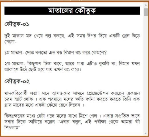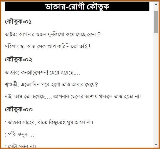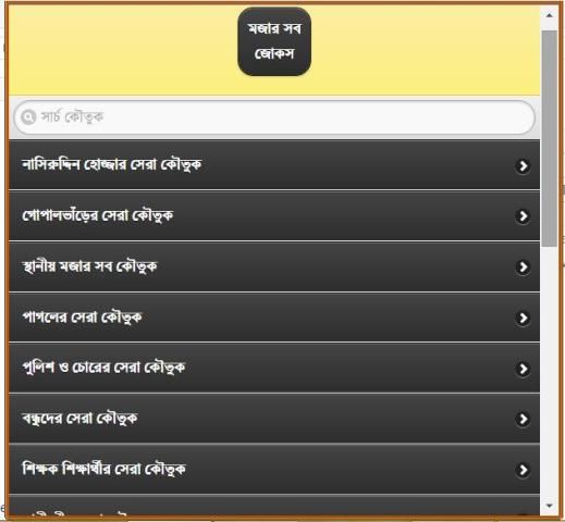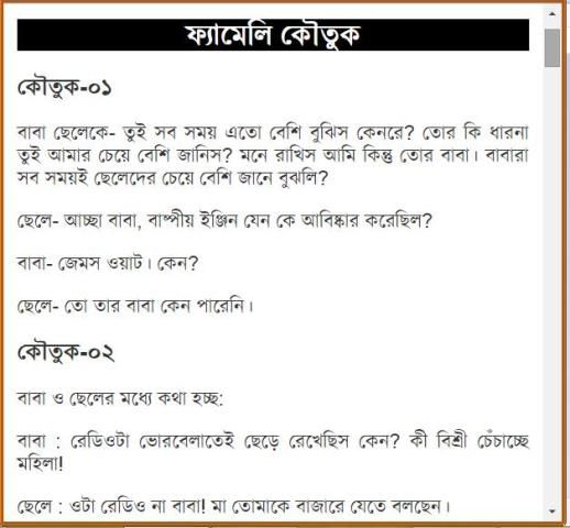 বাঙ্গালী সবসময় হাসিখুশি থাকতে পছন্দ করে। তারা দিনের একটা বিশেষ সময় হাসি গল্পে কাটিয়ে দেয়। তাদের গল্পের একটা বিশেষ অংশ জুড়ে থাকে চুটকি, কৌতুক বা রসের আলাপ। তারা এতই কৌতুক প্রিয় যে তারা সাধারণ কথাও কৌতুক মিশিয়ে বলতে পছন্দ করে। গল্পে আড্ডায় সেই ব্যক্তিই বেশী প্রাধান্য পায় যে সবচেয়ে বেশী কৌতুক জানে। যারা কৌতুক জানে তাদের ভাণ্ডারে আরো নতুন কৌতুক যোগ করবে এই অ্যাপটি। আর যারা জানে না তারাও এই অ্যাপটা ব্যবহার করে নতুন অনেক কৌতুক জানতে পারবে।
