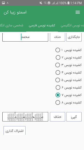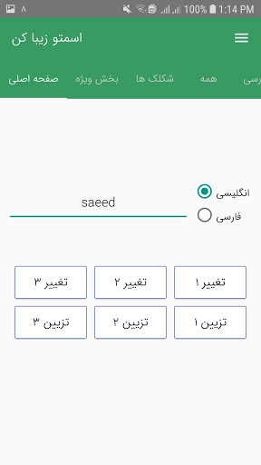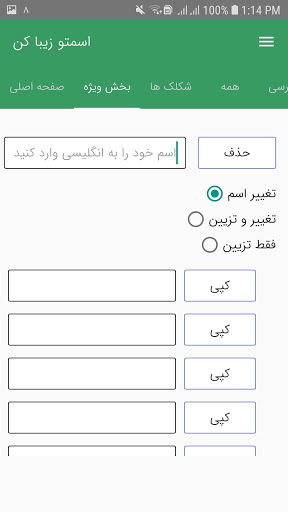 آموزش استفاده : اسم مورد نظرتونو با استفاده از گزینه های ( تغییر 1 و 2 و 3 ) یا گزینه های ( تزئیین 1 و 2 ) زیباسازی کنید بعد برای کپی شدن روی طرح مورد نظر ضربه بزنید و در برنامه ای که میخواید اسمتونو داخلش تغییر بدید وارد شده و روی قسمت نام دستتونو نگه دارید و گزینه ی چسباندن ( paste ) رو انتخاب کنید تا اسمتون تغییر کنه.