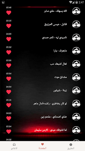 ايضا التطبيق يحتوي على قائمة للاغاني المفضلة التي تختارها انت ويمكن الاستماع الى الاغاني بشكل تلقائي واحده تلو الاخرى بالخلفية لمجموعة من الاغاني العربية الرومنسية والحزينة الرائعة والجميلة المنوعة التي يمكنك الاستماع لها والاستمتاع بها واستماعها في كل الاوقات دون الحاجة الى انترنت .
