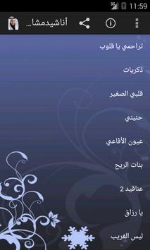 وبعض الأناشيد فى التطبيق ( أبكي على شام الهوى , أفواه القرآن ,العيد ,المستحيل,أنا واح,إنسان,بيني وبينكم, تراحمي يا قلوب ,رتل معي,رحمن ,يا سوريا رغم الألم,صحبتك سمعتك,عمر الفاروق , يا يمن,انت مين,قلّي,شفيع الخلائق,يبه, لا إله إلا الله,صحبتك,ما طلعنا,سيد الأخلاق,الضرير,جل البديع,تذكر,يا من إذا,أضفيت,ريض يا الطارش,الأسماء الحسنى,يا بلادي,أنا العبد,قلبي الصغير, النعمه زوّاله,أشكو إلى الله,أنت رحماني , يا سرور,كتاب الله, أنت المعين,أصلي عليك,أرى الدنيا,أشد الجهاد,ليلة القدر ,يد الإبداع ,يامن يرى,بكت عيني,بيت,الله ,طلع البدر علينا,ياربنا,دعوني أناجي,ربِ سبحانك ,حنيني ,مع الله, يالله ,نوح الحمام, إلا صلاتي ,بكل الشوق,أسير الخطايا,إلهي سيدي ,أرحم الرحماء,متفرد ,أنشودة الأذان, أبا الأنبياء ,قف بالخضوع,عيون الأفاعي,هناك رسول الله,وأحسن خلق الله,ويل قوم ,منهاج الهدى,فأشهد,براهين,فراق الحبيب,جزى الله,خاتم,الرسل,حصان رزان,أيا من يدعي الفهم,خلي ادكار الأربع,رمضان,يا مرحبا,بنات الريح ,مؤمن ,جهرا,تبارك الرحمن ,إن رضوا ,ليلي ,أدعوك ,زمزم ,خليجي,دنياك ,ياأقصى,أرض ,السلام , يشفيك,وطن, يا ما كان,الأرض لله,العاصمة,الله الله, دموع على أستار الكعبة,نفسي هفت,هذه عُمان,للحرم, عزمت عالروحة,قالوا سكت ,رأيت الذنوب,رمضان,شكرا يا مصر,وقفت وأجفاني,يالأمارات,يا نقاد الشعر,يا وينتي,طهور,يا رزاق,محمد صلى الله عليه وسلم,رتل معي,كُن محسناً,دعاء الكويت,دعاء مصر , زايد,سعودي,كلامك عنوانك ,الأرض لله ,مالي وقفت على القبور,ليس الغريب ,قريح القلب ,تغيرت المودة والإخاء, إذا قربت .. ,ياحلومعنى الطفولة , يمه, إلهي)