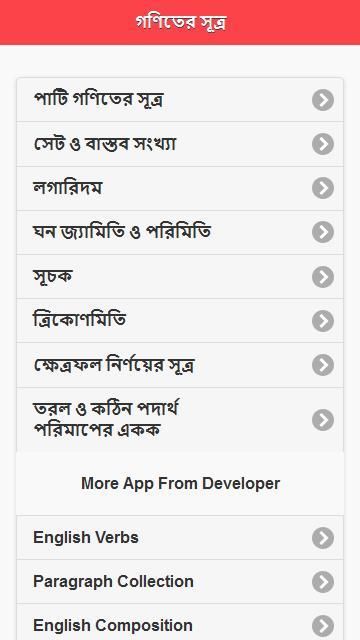 পাটি গনিত, বীজগণিত, জ্যামিতি সহ আরও অনেক সুত্র রয়েছে এই এপটিতে।