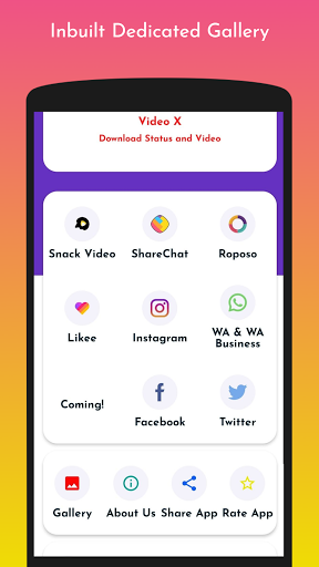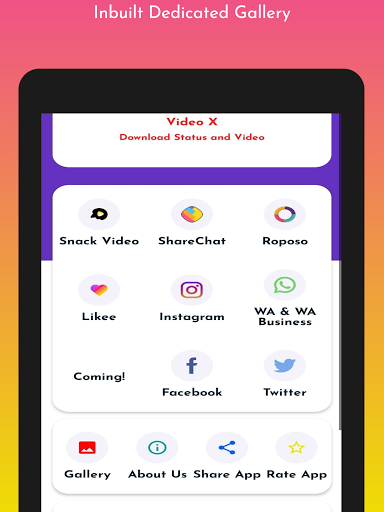 تتيح لك Downloader Video Downloader، Story and Status Story - Video X تنزيل مقاطع الفيديو والقصة وحفظ الحالة من منصات الوسائط الاجتماعية مثل Instagram و Whatsapp و WhatsApp Business و Facebook و Sharechat و Roposo و Twitter على جهازك في سرعة البرق. الفيديو X أقل من 10 ميغابايت، إنه لايت وسهل الاستخدام. لا يؤثر تنزيل هذا التطبيق على أداء هاتفك الذكي.