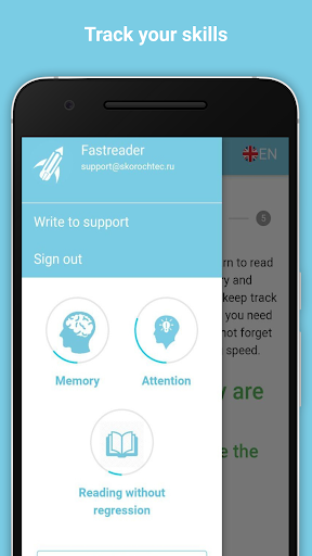 Education in Fastreader is primarily aimed at practice and training. The course is divided into 5 levels, in each of which you will be asked to perform interactive exercises aimed at the development of certain skills. For example, "Schulte Tables" or "Reading Without Regressions". Progress on skills will be automatically displayed on their indicators. Filling all the indicators, you go to the next level.
