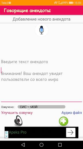 الآلاف من النكات المختارة من الناس من جميع أنحاء العالم.يتم التعبير عن النكات إما عن طريق صوت المستخدم نفسه أو صوت النظام.يمكنك بدء التطبيق بالقول: "موافق Google Open Anecdote".ضع هاتفك أو جهازك اللوحي بالقرب من نفسك، وبدون انهار بعيدا عن شؤونك، استمع إلى نكات لا تضاهى من مستخدمينا.