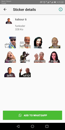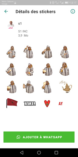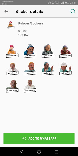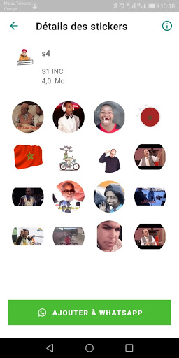 التطبيق سهل الاستخدام و خفيف على الهاتف يمكنك اختيار حزمة ملصقات مغربية للواتساب و اضافتها بكل سهولة بالضغط على زر الاضافة .