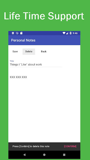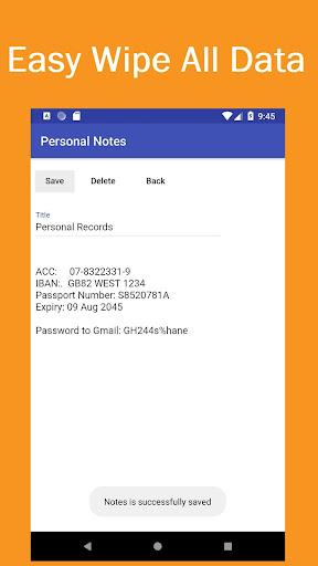 للاستخدام، فقط قم بتنزيل وإدخال كلمة مرور فريدة (يجب أن تتذكرها)، ثم يمكنك البدء في كتابة معلوماتك السرية. إذا قمت بإدخال كلمة المرور بشكل خاطئ مرتين على التوالي، فسيقوم التطبيق افتراضيا إلى قائمة ملاحظة فارغة. هذا هو فقط في الحالة التي تضطر إلى فتح التطبيق. سيتم إلغاء تثبيت التطبيق تلقائيا إزالة جميع الملاحظات التي يتم تخزينها التطبيق على الهاتف. يمكنك تغيير كلمة المرور الخاصة بك في أي وقت باستخدام إعداد "تغيير كلمة المرور" في التطبيق.