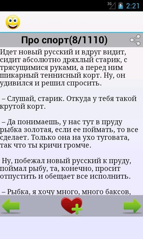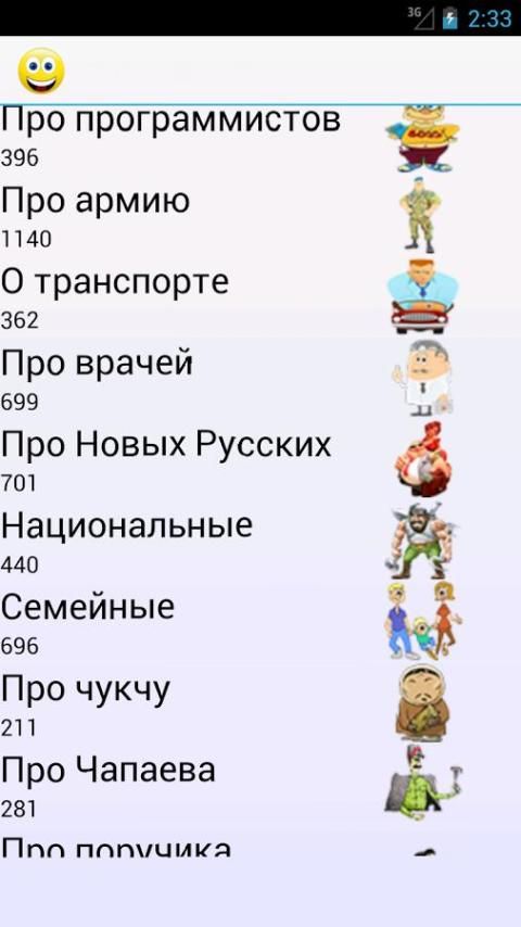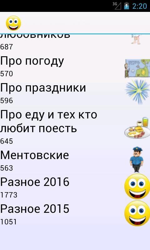 وهذا كله معا في مكان واحد، والتي من السهل جدا لتثبيت واستخدام! جمع يحتوي على النكات الأكثر مضحك. هناك 3 فئات من النكات، التي جمعت أفضل النكات التي تذهب peremeshku!