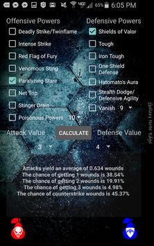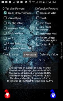 A probability calculator for Heroscape and Arena of the Planeswalkers that gives average wounds per attack, and percent chance of getting at least 1-6 wounds in that attack.