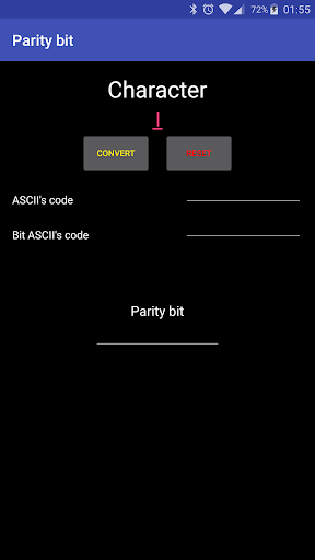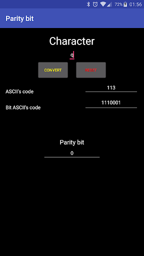 The app will print the ASCII code of that characted and the binary of that ASCII code. Then it will show the Parity bit simly by typing one character in the first field then pressing the Convert button.