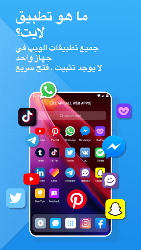 يوفر تطبيق Lite جميع تطبيقات الويب لـ Facebook و instagram و Tik Tok و Vimeo و MeetMe و Twitter و Badoo وما إلى ذلك.