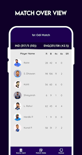 . يمكنك الاستمتاع بالكرة لعبة الكريكيت اليوم بالكرة بشاشة واحدة، لا حاجة للتنقل عبر التطبيق غير ضروري. يمكنك اتباع تفاصيل أي مباراة مباشرة وأيضا يمكن أن نرى التهديف عن طريق الرماة والأرضيات.