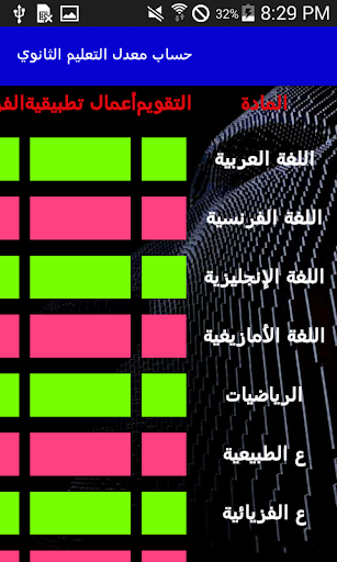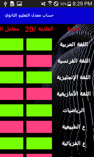 حساب معدل التعليم الثانوي لكل السنوات من الأولى الى التاثلة ثانوي بالإضافة الى شهادة البكالوريا تم إنشاء هذا التطبيق لتلاميذ الثانوي بحيت يمكنهم حساب معدلاتهم بكل سهولة.