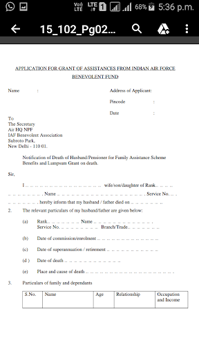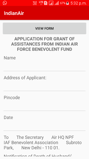 Application PD Grant Of Assistance From Indian Air Force Benevolent Fund