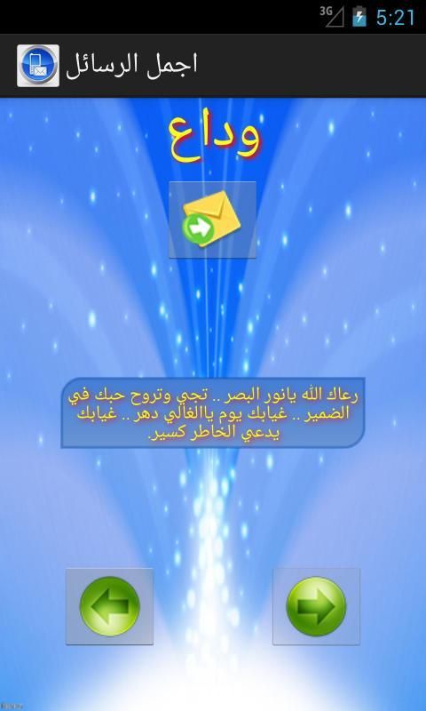 تطبيق جميل لإرسال الرسائل. يحتوي على كم كبير من الرسائل مصنفة حسب النوع و المناسبة: اسلامية , حِكَم , ترحيب , عتاب .... الخ.