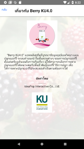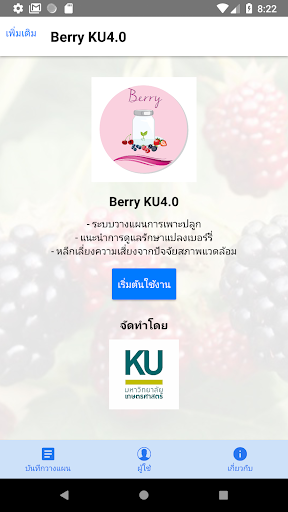 “Berry KU4.0” แอพพลิเคชั่นที่บูรณาข้อมูลอุตุนิยมวิทยา แผนปลูกเบอร์รี่ ระบบคำแนะนำในขั้นตอนต่างๆ ของการปลูกเบอร์รี่ตั้งแต่เตรียมดินจนถึงการเก็บเกี่ยว ผู้ใช้สามารถเลือกการเพาะปลูกเบอร์รี่ให้เหมาะสมกับพื้นที่ พันธุ์เบอร์รี่ วิธีการปลูก เพื่อให้การเพาะปลูกเบอร์รี่ประสบผลสำเร็จตามต้องการได้