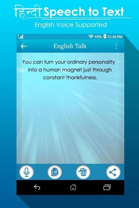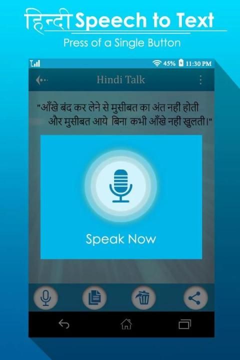 الهندية الكلام إلى نص التطبيق هو بسيط وتطبيق سهل الاستخدام. يظهر النص بعد الانتهاء من التحدث، لذلك قد يستغرق دقيقة واحدة التعود.