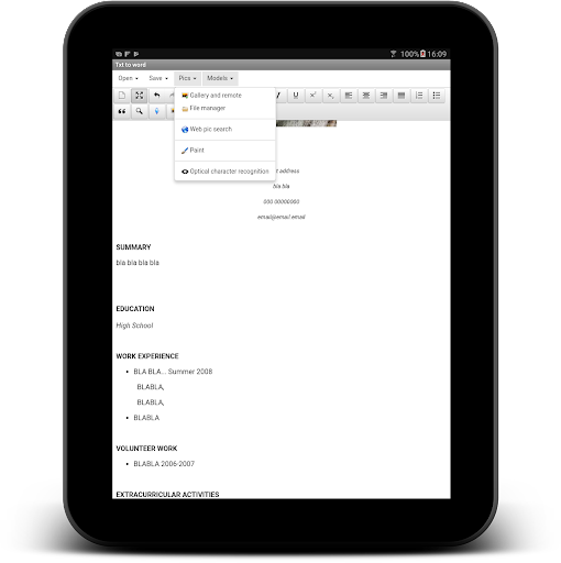 النص 2 الكلمة هي بلا شك معالج النصوص أدوات application.Desktop الصف الخاصة بك في متناول يدك لمعالجة النص والأساليب من النص تغيير مع عدد قليل من الصنابير. إضافة صورة من معرض أو المجلد البعيد.