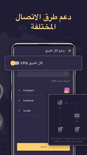 3. الوضع لكل تطبيق. يمكنك تعيين تطبيقات محددة لتجاوز VPN