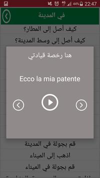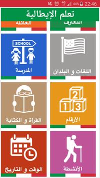 يتحوي التطبيق 33 درس يضم أزيد من 1000 كلمة وجملة باللغتين العربية والإيطالية كتابتاً وصوتاً (مع النطق الأصلي للكلمة) والدروس هي كالأتي: