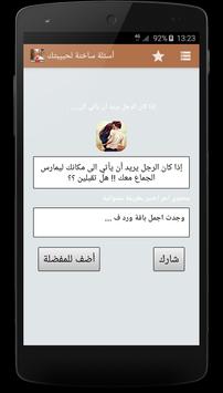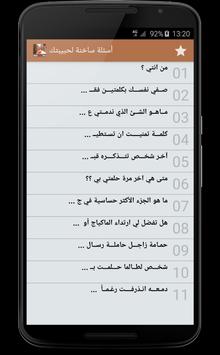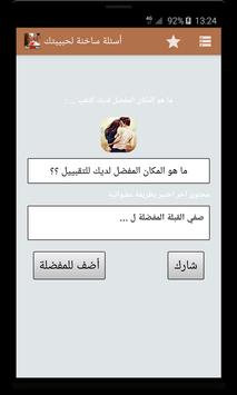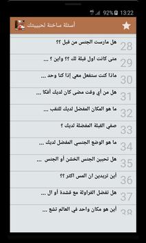 يقدم لكم البرنامج مجموعه كبيرة الأسئلة الساخنة – للكبار فقط تشمل أجمل و أروع الأسئلة الغرامية التي يمكن أن ترسلها لمن تحب, يمكن ارسالها عبر وسائل التواصل الاجتماعي مثل واتساب أو فيسبوك, ثم تصميم التطبيق خاصة للعالم العربي بشكل بسيط ومفهوم للجميع مع مراعات تيسير الوصول لأغلب الخدمات.