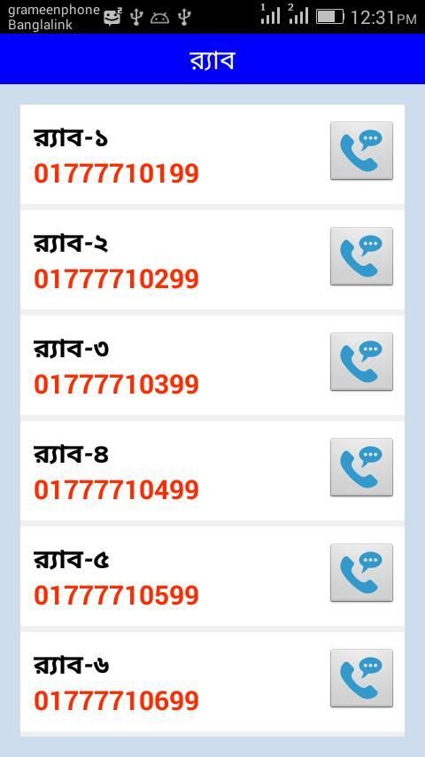يقدم الشرطة والهاتف RAB عدد التطبيق مصدر كبير من عدد مراكز الشرطة الهاتف لشعب بنجلاديش. سوف الشرطة رقم الهاتف التطبيق تكون مفيدة جدا للأشخاص الذين يحتاجون رقم هاتف شرطة الطوارئ في أي مركز شرطة Bangladesh.User يمكن العثور على أي رقم هاتف مركز للشرطة من الشرطة والتطبيق راب ويمكن استدعاء الشرطة باستخدام التطبيق.