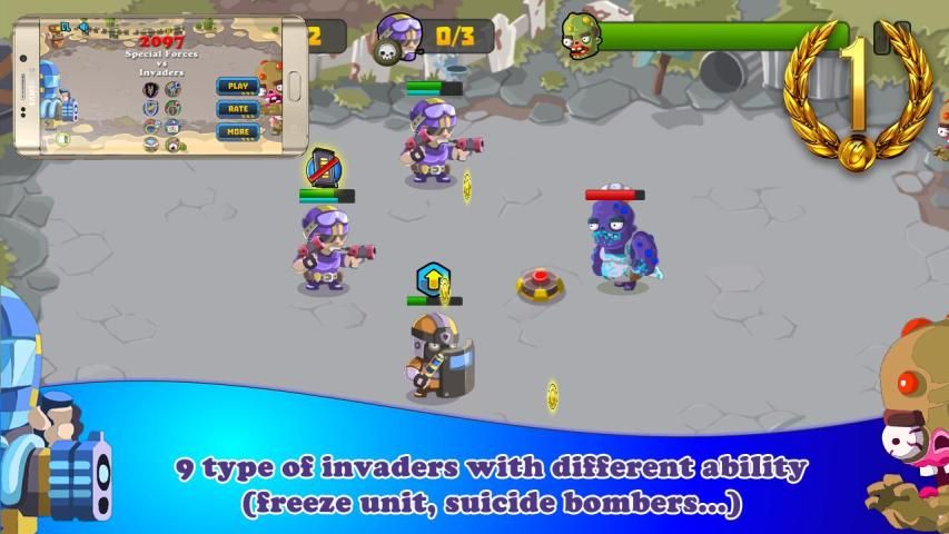 ✔ 9 نوع من الغزاة مع قدرة مختلفة (وحدة تجميد الانتحاريين ...)