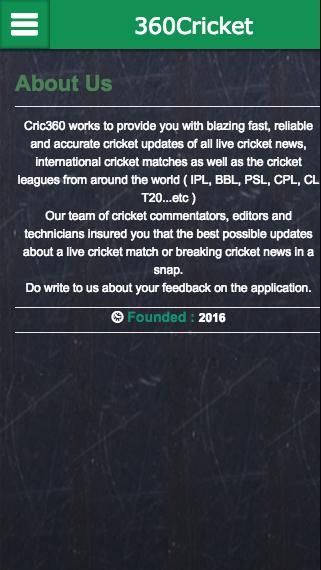 Cric360 يعمل على توفير لكم مع اشتعلت فيه النيران بسرعة والتحديثات الكريكيت موثوقة ودقيقة لجميع الأخبار ويعيش الكريكيت، الكريكيت الدولي مباريات فضلا عن البطولات لعبة الكريكيت من مختلف أنحاء العالم (IPL، BBL، البولندي، CPL، CL T20 ... الخ)