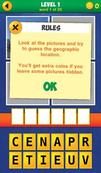 Travel the world and guess the names of famous cities, countries, and landmarks. If you like word quiz games like 4 Pics 1 Word: What's the Word, you'll love this new family game! Look at the picture and guess the word!