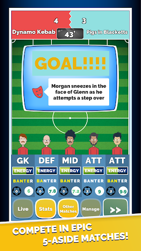 Exciting. All matches are simulated to match the fast and chaotic feeling of a 5 a side game. 0-0s are highly unlikely when a goal could come from anywhere! A five goal cushion might seem safe but a dodgy keeper or scintillating striker could quickly change the match.