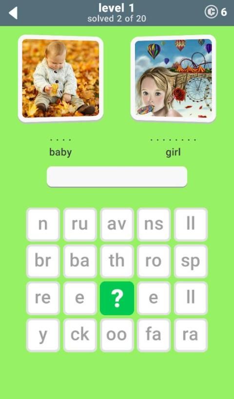 كلمتين في الصورة. 20 كلمة في المستوى. 600 كلمة في اللعبة. يمكنك أن تجد كل منهم؟ أحيانا تضطر إلى التفكير فيما وراء ما هو واضح. حظ سعيد!