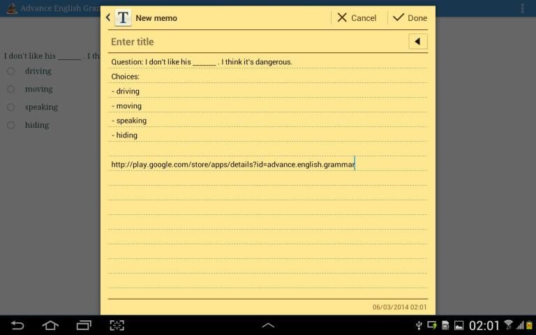 الاف من افضل تطبيقات اندرويد في 9Apps 20,000+ مستحدمين يحملون Advance English Grammar احدث الاصدار مجانا كل أسبوع في يمكنك ترفع كفاءتك عن طريق استخدامه..9Apps هذه التطبيق الحلوووه تصدر في 2017-01-07 سيطلق التطبيقات الكثيرة مؤخرا،يمكنك تحملها وتشاركها مع أصدقائك..