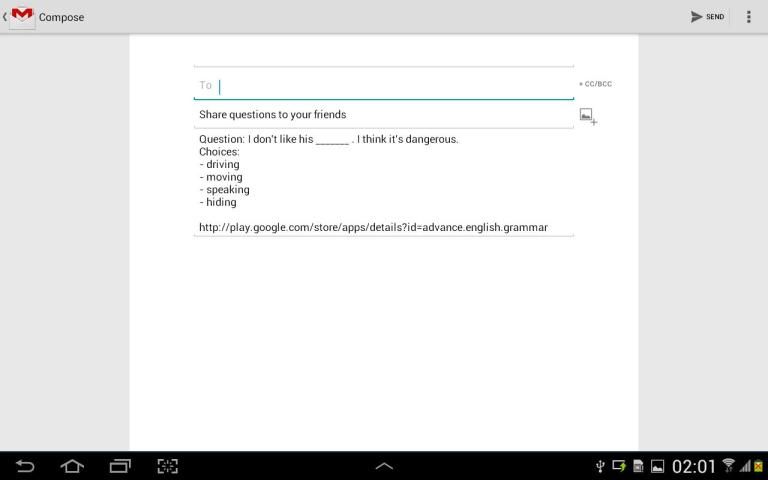 يمكنك مشاركة الأسئلة في الفيسبوك، تويتر، بريد جوجل، البريد الإلكتروني، والتراسل، وجوجل + مذكرة للتباحث مع أصدقائك.