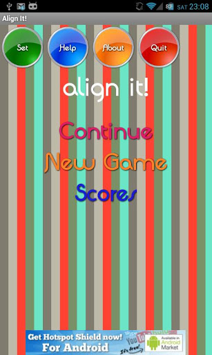 Train your brain and attention with this addictive gameIMPORTANTYou can buy the AD FREE version from Amazon App Store, until Google will allow selling apps in my country.A fun way to relax.Do you have what it takes to be the Chuck Norris Aligner master? Or even more: the Chuck Norris Reloaded Aligner master: the supreme Aligner grade? Or maybe you have enough patience to be the next Endurance Master?The rules are simple: align 5 or more circles in line, column or diagonal and win points. The more circles you align, the more points you39;ll get. Unlock all achievements and gain Openfeint points. The game has 3 difficulty levels: EASY, MEDIUM and HARD corresponding to 4, 5 or 6 colors.Are you able to discover the secret achievements?Now with Openfeint integration Share your scores with your fiends Unlock all achievements and win Openfeint points 630 points for now more to comeNotes: You can access the Openfeint Dashboard by clicking High Scores and then the Open Feint button.Tags: openfeint, feint, open feint, five or more, align it, brain, colors, 5 in a row, 6 in a row, connect 5.Future features: timer mode; undo last X moves. more achievements
