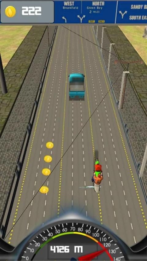 يجرؤ على الاقتراب إما عن طريق نفس السيارات الجانب أو عدم اندفاعة على العكس السيارات حارة أو سيارة شرطي غاضبة لجمع خيرات. أعلى الزيادات والعتاد سرعة الدراجات النارية إلى المستوى التالي تلقائيا الاثارة أوكتان مرتفع في القيادة أو ركوب الخيل. في محاولة لمعرفة سر أو مفاجأة المثيرة أو الرسوم المتحركة متسابق أثناء اللعب من متسابق من خلال لمس الشاشة أثناء مسرعة مجنون.