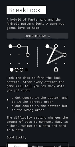 Link the dots to find the lock pattern. After every attempt, the game will tell you how many dots you got right.