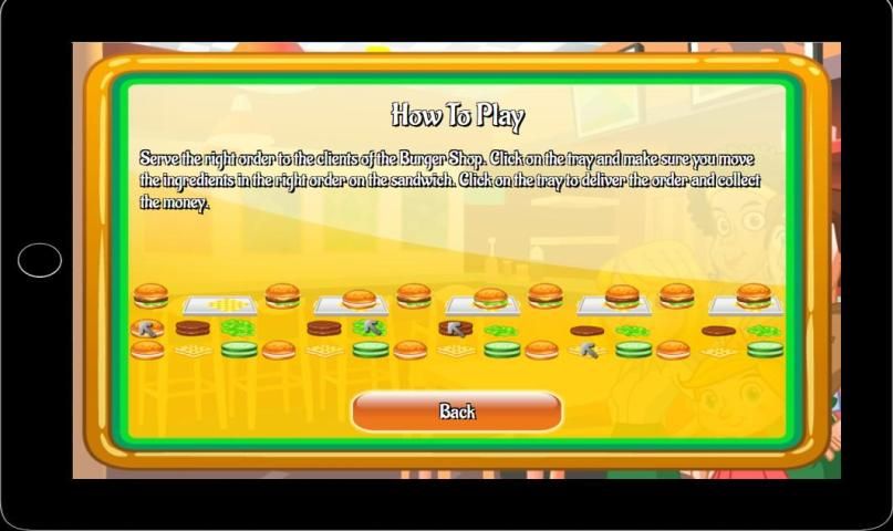اضغط على لوحة والتأكد من نقل إينجيدينتس الصحيحة بشكل مناسب على شطيرة برغر و. اضغط على همبرغر لنقل طلب و لا تنسى لجمع المال.