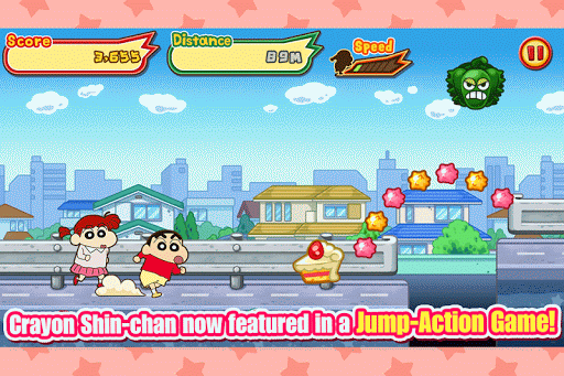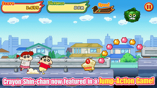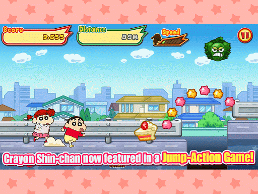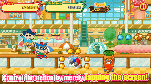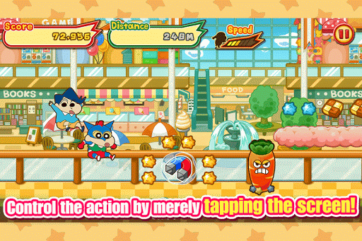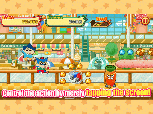● As Shinchan vigorously dashes onward, dodge obstacles and gather sweets by tapping the screen!