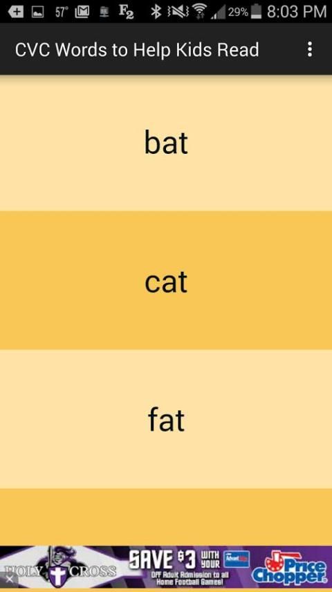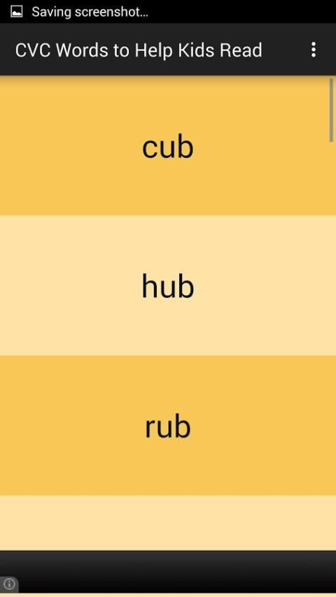 وشملت أكثر من 100 كلمة CVC في هذا التطبيق. تم تقسيمها إلى 5 مجموعات على أساس حرف العلة المتوسطة في كل كلمة. وتشمل مجموعات الكلمات مع صوت قصير، والكلمات مع صوت قصير ه، والكلمات مع قصيرة ط الصوت، والكلمات مع الصوت س القصير، والكلمات مع الصوت ش قصيرة.