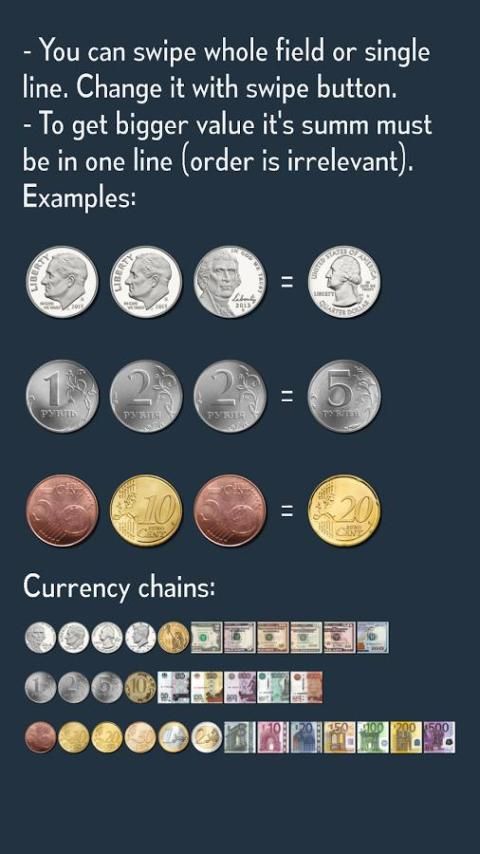- Goal of the game is to obtain maximal value of all currencies. (100$, 500€, 5000₽)