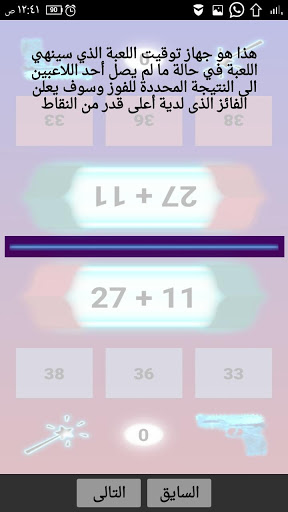 هذه اللعبة تساعد شخصين على حل المشاكل الحسابيه بطريقة تنافسية ولكل لاعب نوعين من الأسلحة لتشتيت تركيز اللاعب الاخر فلا تتردد في استخدام الأسلحة، ولكن احترس واختر الوقت المناسب للاستخدام السلاح المناسب وهناك سلاح مشترك بينكم يمكن لأي واحد منكم استخدامه ولكن هذا السلاح سيعود بالخسائر على واحد منكم ذلك يعتمد على الحظ كثيرا إذا حظك سيء، لا تحاول استخدامه قد يعود لك بمزيد من الندم