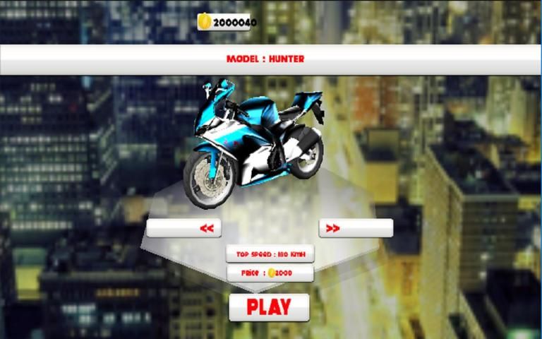 يشعر من التشويق وسباق بلا منازع في مدينة موتو Racer.3 في هذه اللعبة يمكنك ركوب دراجة نارية في موقعين مختلفين واحدة على البطاقة اليوم والآخر هو بطاقة مشهد ليلة. أنواع مختلفة من الدراجات للاختيار من بينها هنتر، النسر، المتسابق، المتسابق العاشر، نماذج الدراجة. السفر مسافة أكثر لتسجيل رقم قياسي