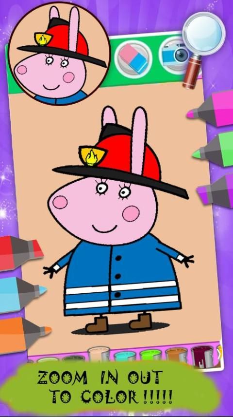 يحتوي هذا التطبيق العديد من الرسومات من خنزير بيبا وحيوانات مختلفة للون. هذا التطبيق متوافق مع العديد من الأجهزة (جهاز لوحي، أندرويد، الهاتف).