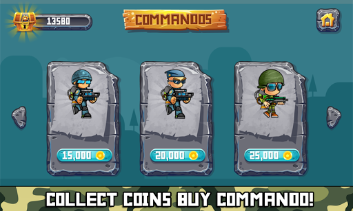 عليك أن تبدأ مع المدافع خلال الطيران والمشي لقتل الأعداء، ولكن في جميع أنحاء كل لعبة عليك جمع القطع النقدية وشراء كوماندوز جديدة من المحل! اختيار الكوماندوز المفضلة لديك ثم نعود للعب.