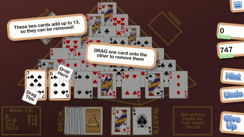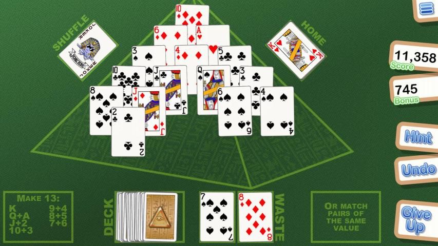 إزالة أزواج من البطاقات مطابقة والملوك (أو إذا كنت تفضل، الفراعنة!)، أو أزواج أن تضيف ما يصل إلى 13. إذا واجهتك مشكلة، استخدم مهرج لخلط الأوراق، ولكن تذكر أنك سوف تحصل فقط واحدة كل ثلاث جولات!