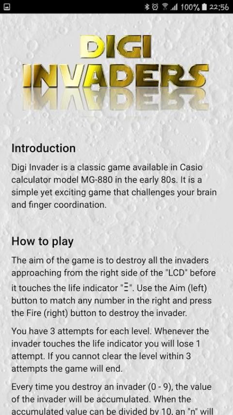 والهدف من اللعبة هو تدمير جميع الغزاة تقترب من الجانب الأيمن من "LCD" قبل أن يلامس المؤشر الحياة. استخدم زر الهدف لمطابقة أي رقم في اليمين واضغط على زر النار لتدمير الغزاة.
