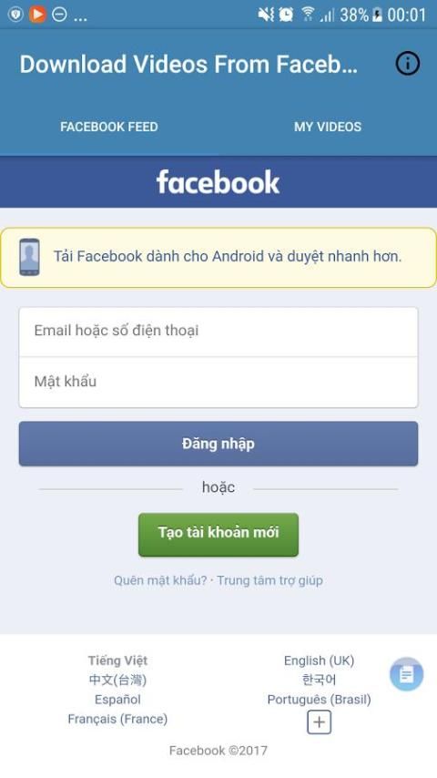 تحميل وحفظ مقاطع الفيديو من الفيسبوك سريع جدا وسهلة مع تحميل الفيديو من تطبيق الفيسبوك. يجب عليك تسجيل الدخول حساب الفيسبوك الخاص بك واختيار الفيديو الذي تريد. انها سوف تحميل تلقائيا إلى الهاتف الخاص بك.