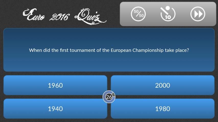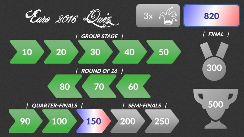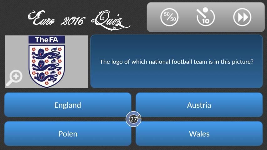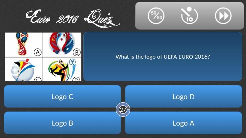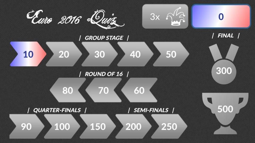 "يورو 2016 مسابقة" يقدم لك أسئلة مثيرة للاهتمام حول بطولة كأس الأمم عام 2016. مسابقة تتكون من حوالي 500 سؤال في اللغات "الإنجليزية" و "الألمانية". والأسئلة هي أسئلة متعددة الخيارات والتي تشمل الصحيح وثلاث إجابات خاطئة. وتشمل هذه المسابقة أيضا "صورة-أسئلة" أين السؤال يمكن الإجابة فقط مع مساعدة من الصورة المعروضة. تتوفر لاعب 15 المستويات. إذا كان الجواب خاطئة تنتهي المباراة لكن لاعب يحصل على فرصة للإجابة على سؤال مكافأة. إذا أجبت على السؤال بشكل صحيح مكافأة، ويحصل على مضاعفة النتيجة. وإلا فإن النتيجة يحصل على النصف.